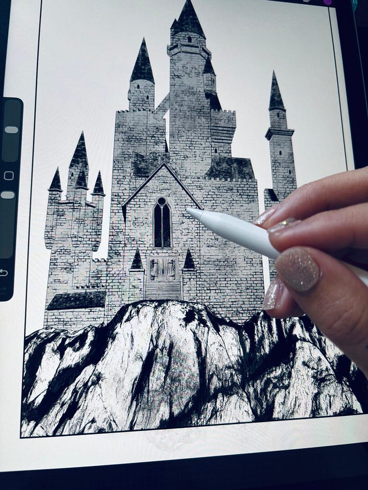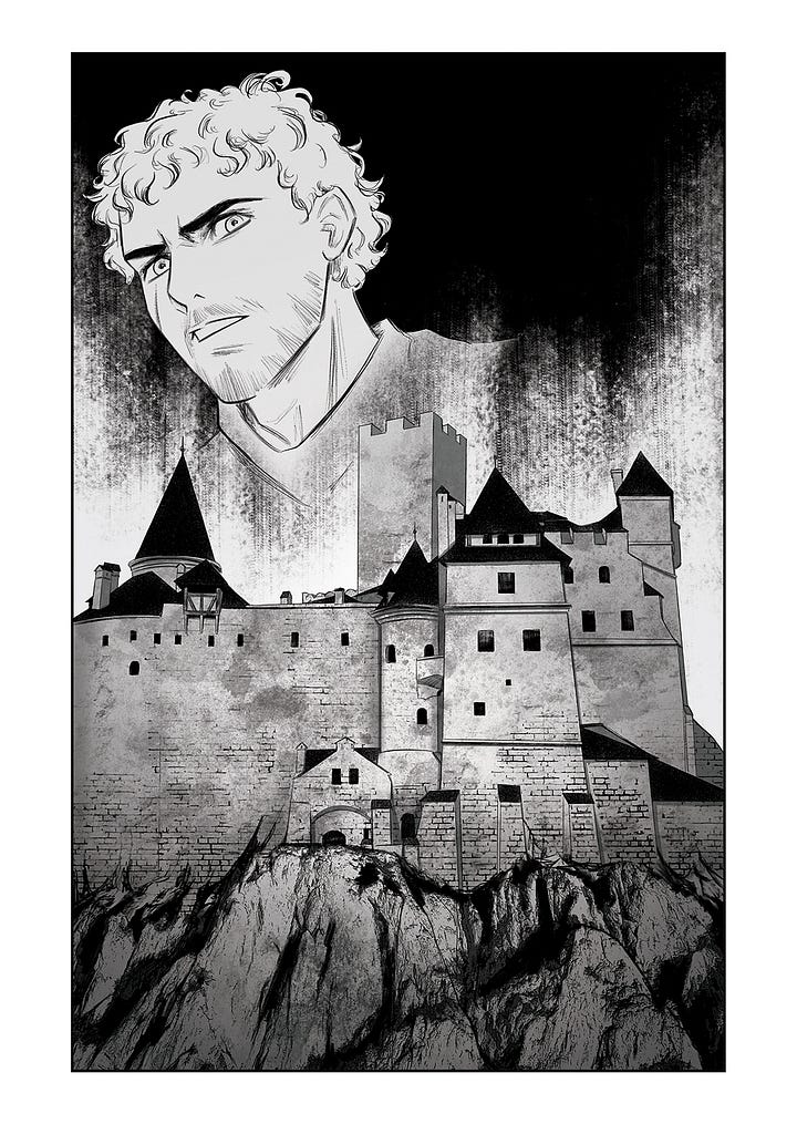 I’m sharing a couple of pages I reworked. The original castle design (left) was annoying me. I like having a lot of spires, but it didn’t feel imposing enough, so I redrew it (right). In the end, I decided to use Bran Castle for the story. It’s a coincidence that Bran Castle is “Dracula’s Castle,” considering this story I’ve written is also a vampire story. I wanted to avoid using it, but it’s perfect for what I need, with some of the architecture tweaked slightly.
